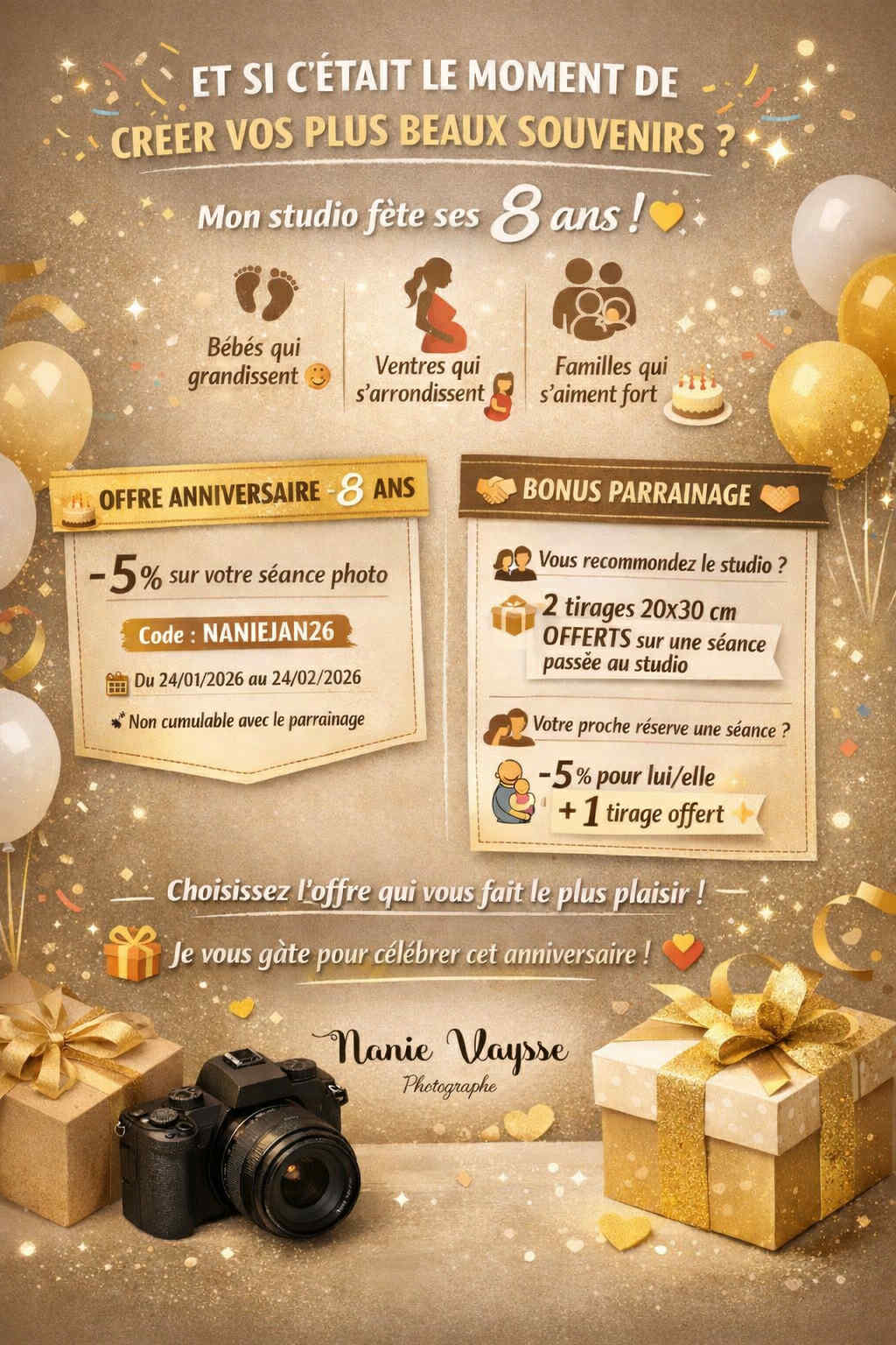 Lire la suite »EXCELLENT Basée sur 78 avis Publié sur Elisabeth Thuel-ChassaigneTrustindex vérifie que la source originale de l'avis est Google. La première fois que nous avons fait appel à Nanie Vaysse, c'était pour des photos de grossesse. Elle a su nous mettre en confiance et écouter nos souhaits. Je suis ravie d'avoir de beaux souvenirs de cette grossesse. Nous l'avons de nouveau sollicité pour les photos nouveau née de notre fille. Avec la fatigue des première semaines, pas facile de rentrer dans le jeu, et pourtant Nanie a su encore une fois nous mettre en confiance, nous rassurer, nous écouter et surtout réaliser de magnifique photos ! Nous sommes retourné la voir pour les shooting photos de noël, et puis comme un évidence, nous avons fait appel à elle pour nos photos de mariage. Je n'aurai choisi quelqu'un d'autre pour rien au monde. J'aime la façon dont elle nous conseille tout en nous écoutant. Sa douceur est rassurante et apaisante. Et ces photos sont absolument magnifiques ! Et le prochain rendez vous est déjà pris pour le shooting de noël de cette année... petit plus... nous avons pu venir avec notre chien à chaque fois, et ça c'est super quand le poilu fait parti intégrante de la famille :) N'hésitez pas, foncez !Publié sur Ombeline AugerTrustindex vérifie que la source originale de l'avis est Google. Une prestation à la hauteur de nos attentes, Mélanie est une photographe très professionnelle, mettant à l'aise et respectant les envies de ses clients. Elle a su capter les instants de notre mariage et les photos sont de très belles qualités. Merci à elle d'avoir immortalisé ce moment précieux.Publié sur MARJORIE THOISONTrustindex vérifie que la source originale de l'avis est Google. Nous avons été très bien reçu pour séance photo naissance, c’est une gentille photographe, et très douce avec notre petite fille, et les photos sont superbe 🥰 Merci de nous avoir permis de capturer ses merveilleux moments. Nous vous recommandons à 100% !!!Publié sur bulbi / manguetteTrustindex vérifie que la source originale de l'avis est Google. Nanie vaysse est une formidable photographe, à l'écoute de ses clients et d'une grande douceur auprès de nos petits trésors ! Cette séance photo à été une formidable expérience à faire à trois avec à la clef des photos plus belle les une que les autresPublié sur paolella brunoTrustindex vérifie que la source originale de l'avis est Google. Nous sommes très content de notre séance photo avec Nanie Vaysse ! Elle a été douce avec bébé , patiente, toujours disponible et très professionnelle. Les photos sont magnifiques, pleines d’émotion. Un super souvenir pour notre famille. N’hésitez pas . Merci encore !Publié sur Kelly LeblondTrustindex vérifie que la source originale de l'avis est Google. Séance de grossesse faite en février. Nous avons été superbement bien reçu. Une très belle expérience avec de très belle photos m. merci encorePublié sur Berthier ValentineTrustindex vérifie que la source originale de l'avis est Google. Nous avons passé un très bon moment pendant cette séance photo grossesse. Nous avons été mis à l’aise et guidés. Nous sommes ravis du résultat obtenu, les photos sont magnifiques ! Nous reviendrons avec grand plaisir pour la séance photo nouveau-né ! Merci encore ! 😊Publié sur Laura CarconeTrustindex vérifie que la source originale de l'avis est Google. Je recommande !!! Une super accueil les photos sont magnifiques au topPublié sur Famille CAZALÉTrustindex vérifie que la source originale de l'avis est Google. Nous avons réalisé un shooting pour la naissance de notre fils, et Nanie Vaysse a su créer une atmosphère apaisante pour bébé. Les photos sont tout simplement magnifiques ! Un immense merci pour ces souvenirs inoubliables.